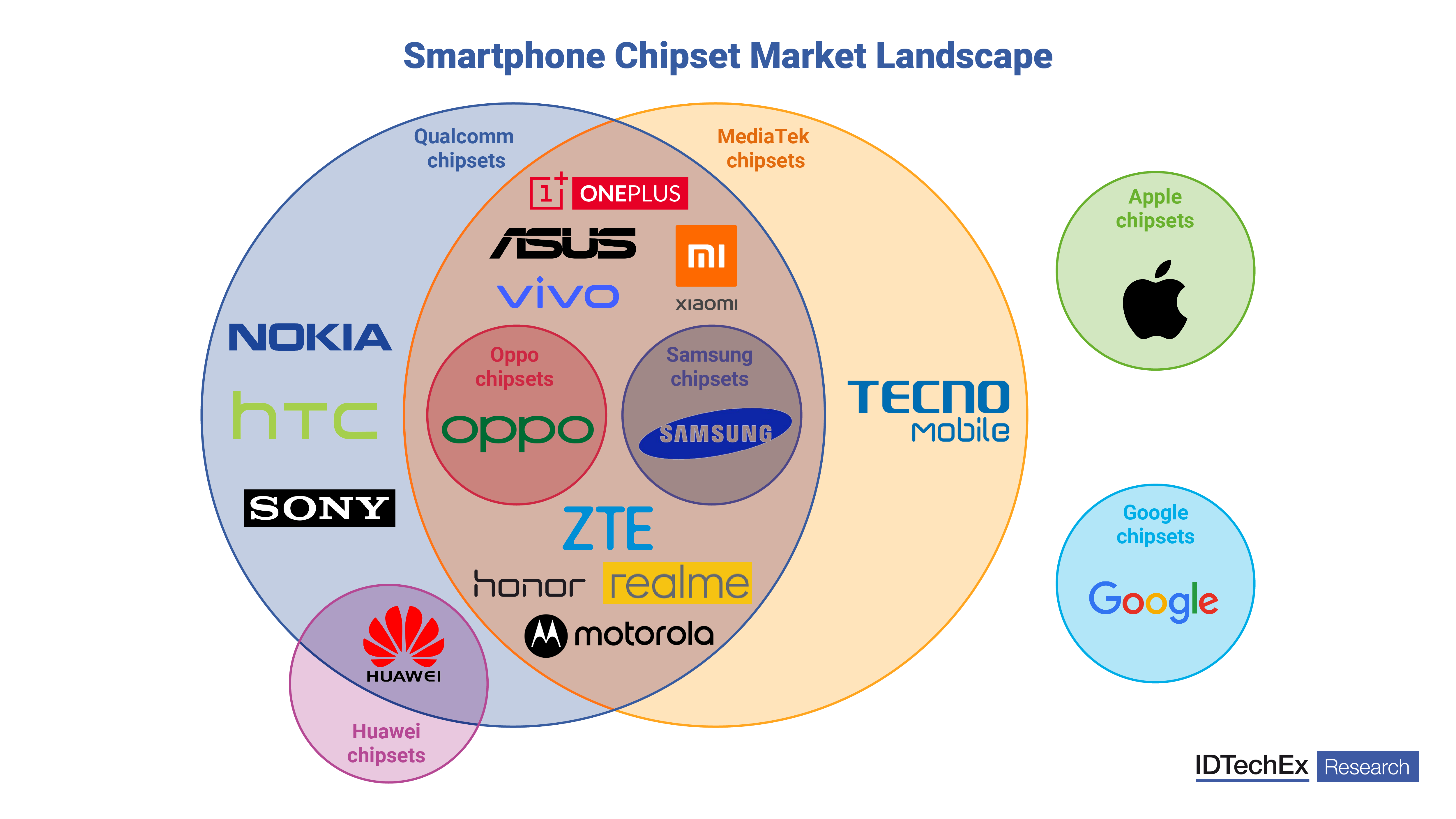Leading smartphones rely heavily on Qualcomm Snapdragon mobile platforms, while Mediatek has seen success in the low mid-range smartphone market. Apple and Google design their own chips that are manufactured by TSMC. Source: AI Chips for Edge Applications 2026-2036: Technologies, Markets, Forecasts.
